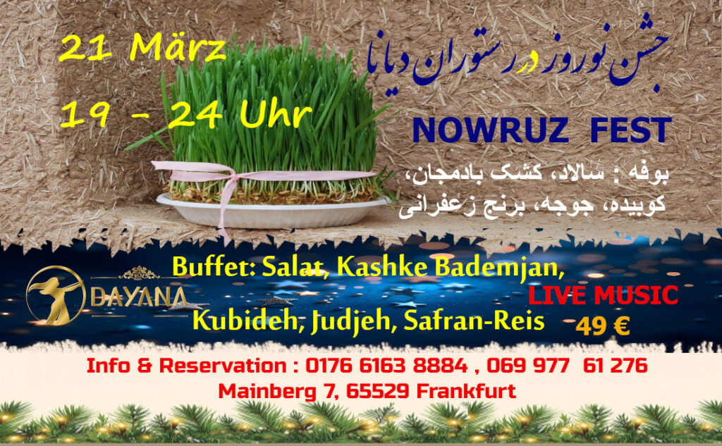 21.03.2025Reservations 9:30 To 14:00„Nowruz ist ein uraltes Fest, das den Frühlingsanfang und das persische Neujahr markiert. Es wird um den 20. oder 21. März gefeiert, wenn Tag und Nacht gleich lang sind (Tagundnachtgleiche). Es ist ein Fest der Erneuerung, des Lebens und der Freude, das von vielen Menschen im Iran, in Zentralasien und anderen Regionen gefeiert wird. Traditionell […]